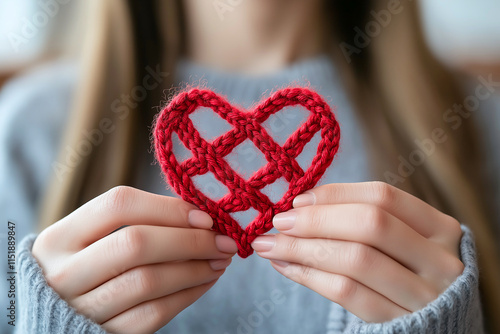 woman’s hands hold red knitted heart, symbolizing love and warmth. soft texture contrasts beautifully with her cozy sweater, evoking feelings of comfort and affection