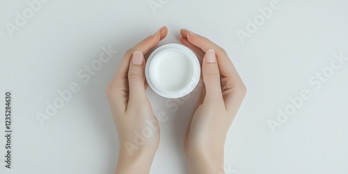 Woman's hands holding cream jar, white background, beauty product, skincare
