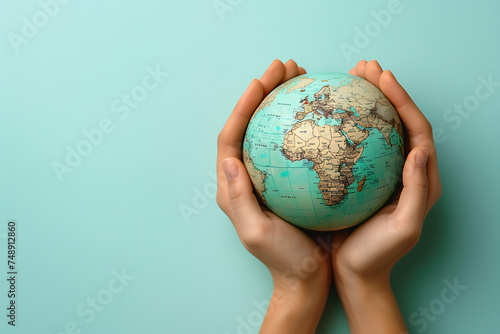 Woman's Hands Holding Globe on Solid Light Blue Background