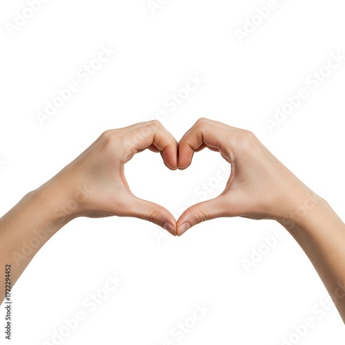 Woman's hands making a heart shape as a symbol of love and care, isolated against a plain white background with space for text