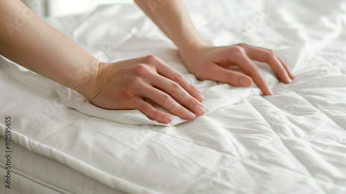 woman's hands making bed with white sheet on the bed in room, closeup