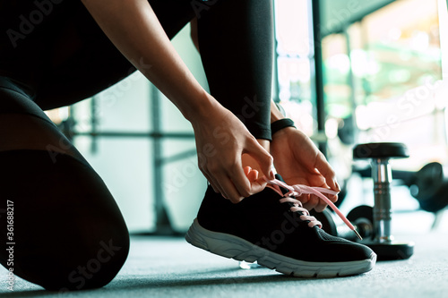 woman's hands tying shoelaces on sport sneakers in gym. dumbbell and water bottle on the ground around the sport girl.