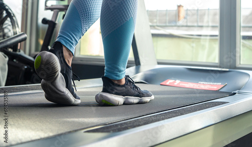 Woman's legs on a treadmill, shoes close-up, cardio workout.