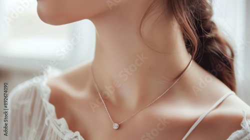 Woman's neck with a silver necklace featuring a minimalist design.
