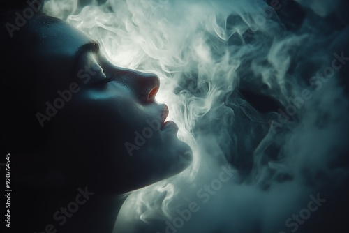 Woman's profile enveloped in smoke, serene and dreamlike atmosphere