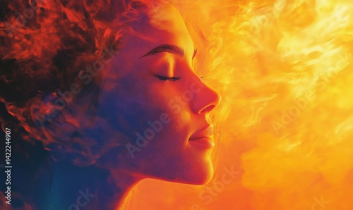 Woman's profile surrounded by vibrant flames and smoke creating a surreal atmosphere
