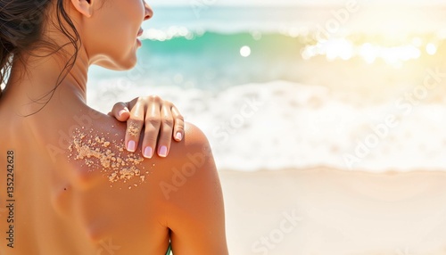 Woman's sun-kissed back with sand on her skin, gazing at ocean waves on a beach