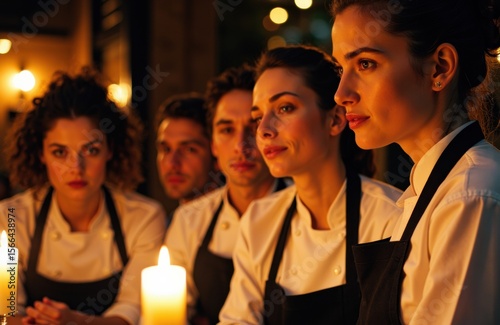 Women chefs listening attentively during a candlelit culinary class or event in a warm, inviting atmosphere