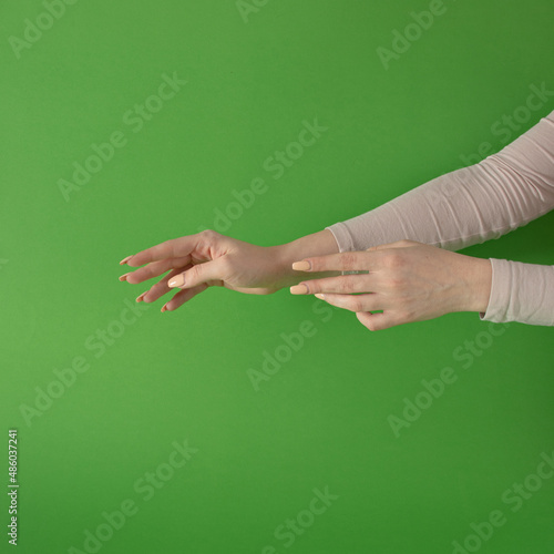 women hands against green background. modern minimalism with copyspace