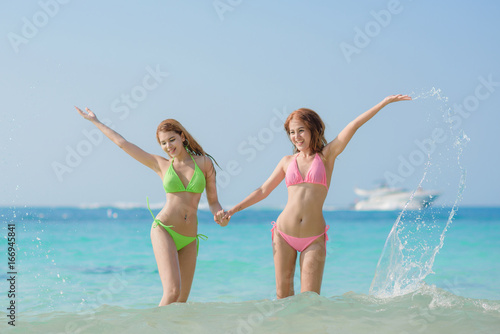 women in bikini enjoy jumping and splatter sea water in beach summer together in daylight