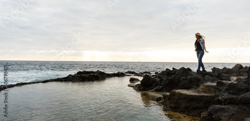 Women on volcanic rocks and blue ocean with waves, white foam and volcanic rocks. Canary Islands. The magnificent coast of the Atlantic Ocean