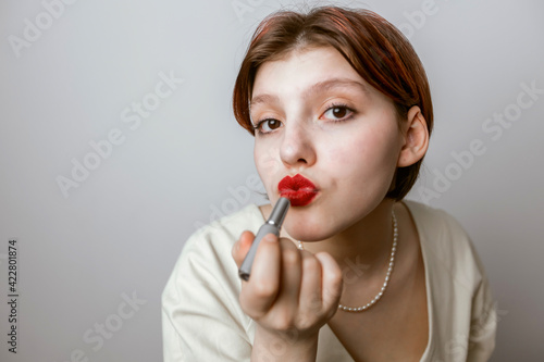 women paint their lips with red lipstick. Light background