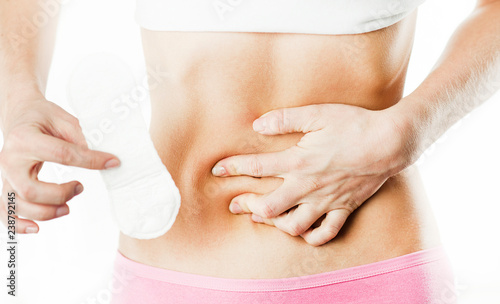 Women Period Product. Closeup Of Beautiful Fit Slim Female Body In White Underwear Holding Sanitary Napkin, Towel In Hand. Woman Holding Clean Period Pad. Feminine Intimate Hygiene. High Resolution