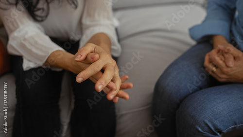 Women sitting together in a cozy living room, their hands clasped in a gesture of support and companionship, suggesting a moment of intimate conversation and connection.