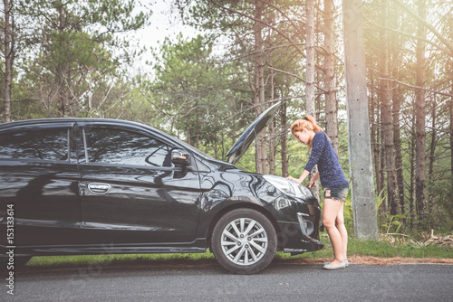 Women The car was broken on the highway. countryside