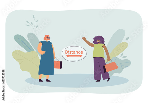 Women with shopping bags greeting while social distancing. Female characters meeting in street flat vector illustration. Coronavirus, pandemic concept for banner, website design or landing web page