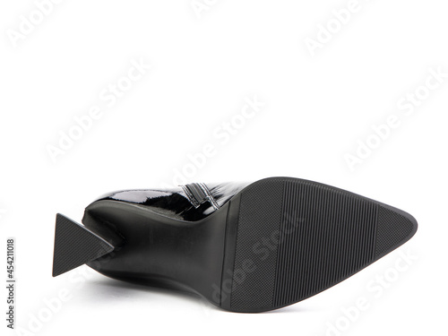 Women's autumn ankle black leather boots with black zip and average heels, isolated white background. Shoe sole view. Fashion shoes. Photoshoot for shoe shop concept.