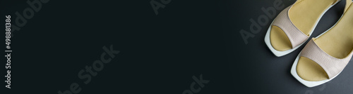 women's beige shoes lie on a black background. Shoes are located at an angle to the horizon. Banner for insertion into site.