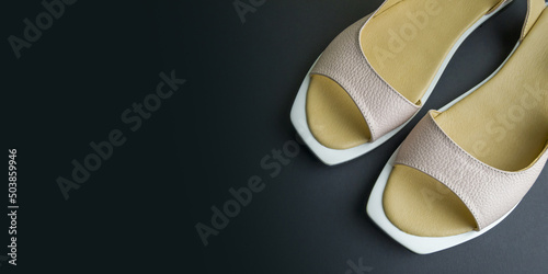 women's beige shoes lie on a black background. Shoes are located at an angle to the horizon. Banner for insertion into site. Horizontal image.