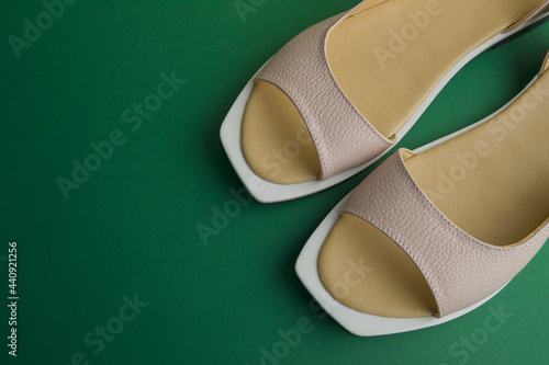 women's beige shoes lie on a green background. Shoes are located at an angle to the horizon