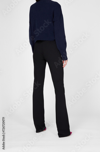 Women's black classic flared trousers on model isolated on white background. Woman wearing black pants, shirt, autumn spring outfit. Back view. Template, mock up. Classic business clothes concept