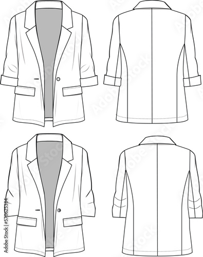 Women's Blazer Jacket Set- Technical fashion illustration. Front and back, white color. Women's CAD mock-up.