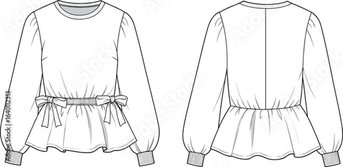 Women's blouse fashion flat sketch, long sleeve top with bow belt, peplum hem, CAD drawing, vector illustration, garment design, sewing template
