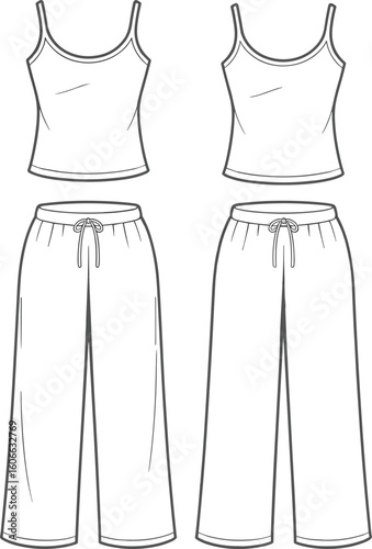 Women's camisole and wide-leg pants pajama set flat sketch, front and back views, loungewear, sleepwear, comfortable apparel, customizable template, fashion design, relaxed fit, home essentials.