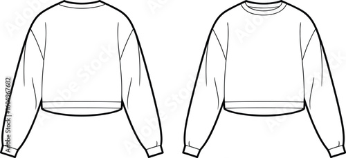 Women’s cropped sweatshirt flat sketch, long sleeve pullover front and back view, technical fashion drawing template, casual apparel design vector illustration outline .