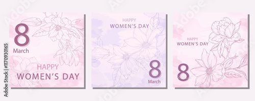 Womens Day Poster. Set of Floral Posters for 8 March. Magnolia Line Art. Flower design Womens Day Greeting Cards. Women Day background Templates with Floral Art.