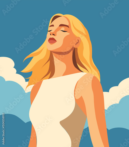 Women's Day. Vector illustration of a beautiful blonde woman with closed eyes looking at the sky. Symbol of freedom, feminism, female dignity. Movements for gender equality and women's empowerment