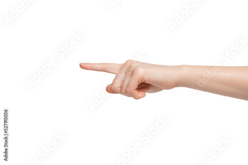 Women's hand points her finger to the side, touch.