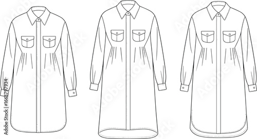 Women’s long shirt dress, button-down front, collar design, long sleeves, chest pockets, loose fit, casual style, comfortable clothing, cad drawing flat vector illustration
