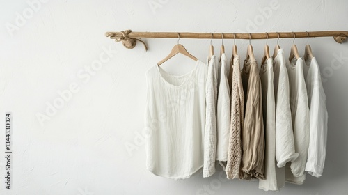 Women's minimal fashion pastel clothes made of washed linen. Stylish female blouses, dresses, pants, shirts on hanger on white background. Fashion blog, website, social media