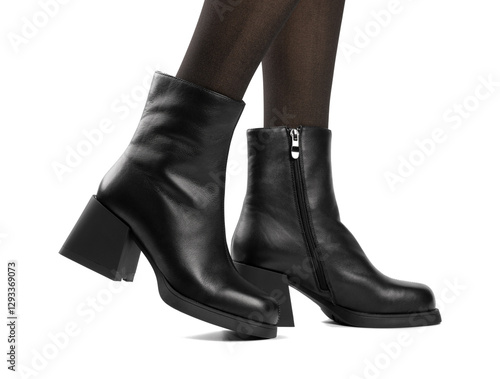 Women's shoes on a white background. Close up of a women's black leather chelsea boots on white background. Footwear for city, urban lifestyle or traveling. Concept of fashion, design and footwear.