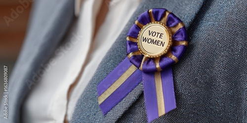womens suffrage symbol, shallow depth of field capture of a purple and gold suffrage ribbon with vote women text on a blazer, symbolizing womens equality day