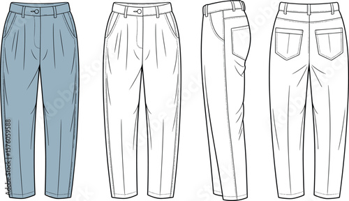 Women’s tapered pants technical fashion flat sketch, front side back view, stylish pleated trousers, vector template for apparel design