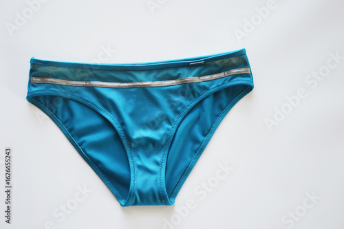 Women's turquoise swimsuit bikini panties on white background. Beachwear.