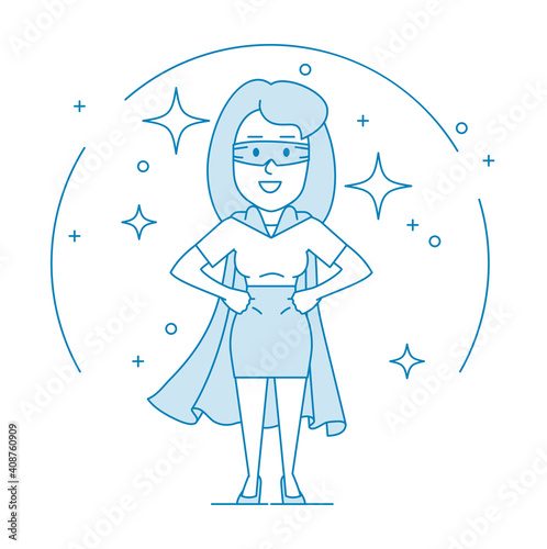Wonder woman. Office worker in a superhero costume. Concept of a leader or company leader. Character - a woman with glasses. Illustration in line art style. Vector