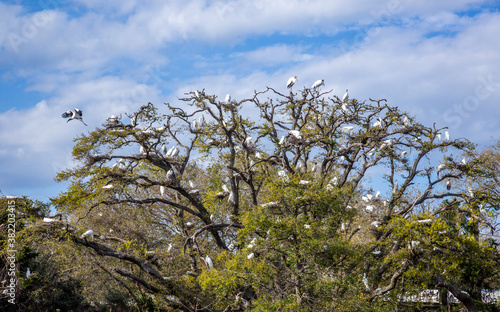 Wood storks and Great egrets perched in a rookery tree in St Augustine, Florida.