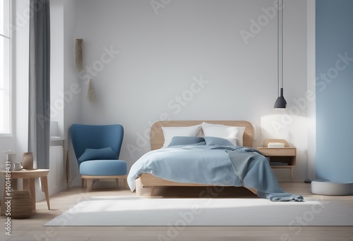 wood wall interior white blue table 3d empty chair bed room concept lounge rendering bedside design bedroom scandinavian background sofa decorative window tone furniture illustration contemporary