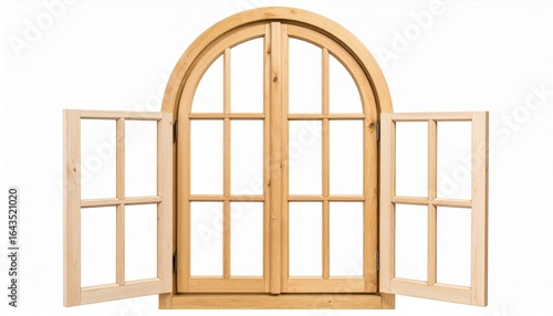 Wooden arched window frame with open shutters, perfect for home design, architecture, and interior decoration themes.