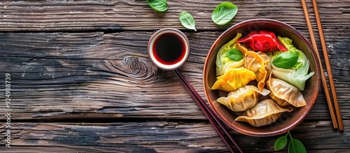 Wooden background with a bowl of colorful dumplings accompanied by soy sauce cabbage and chopsticks leaving room for text in the copy space image