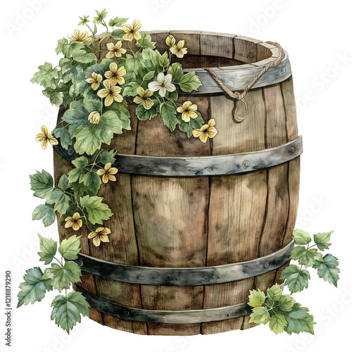 Wooden barrel adorned with blooming yellow flowers and lush green leaves. Rustic charm of wooden texture and vibrant foliage creates a natural, vintage aesthetic. Vector illustration.
