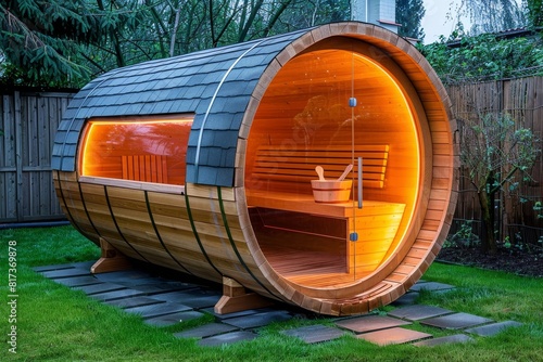 Wooden barrel sauna in garden yard with copy space, blurred background for text placement