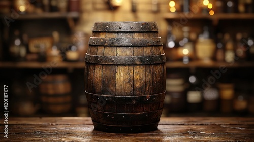 Wooden barrel, tavern, shelf, bottles, dark, aged, wood, rustic, drink, advertising