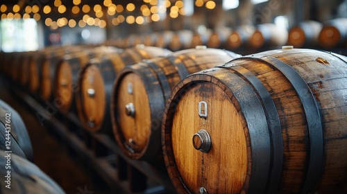 Wooden barrels lined in a rustic distillery, illuminated by warm lights, creating a cozy atmosphere