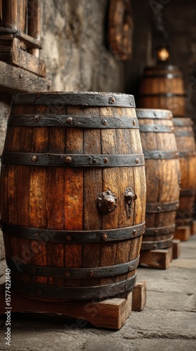 Wooden barrels lined up in a dimly lit cellar showcasing craftsmanship and history from a bygone era