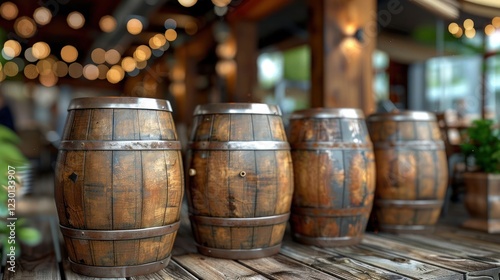 Wooden barrels lined up in a rustic bar setting with warm lighting and blurred background ambiance