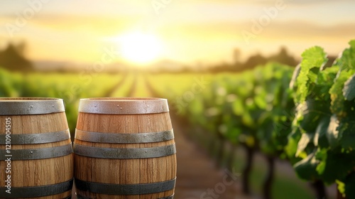 Wooden barrels with sunlit vines in the background, rich sunset hues casting a warm glow, textured wood and soft focus, digital art style